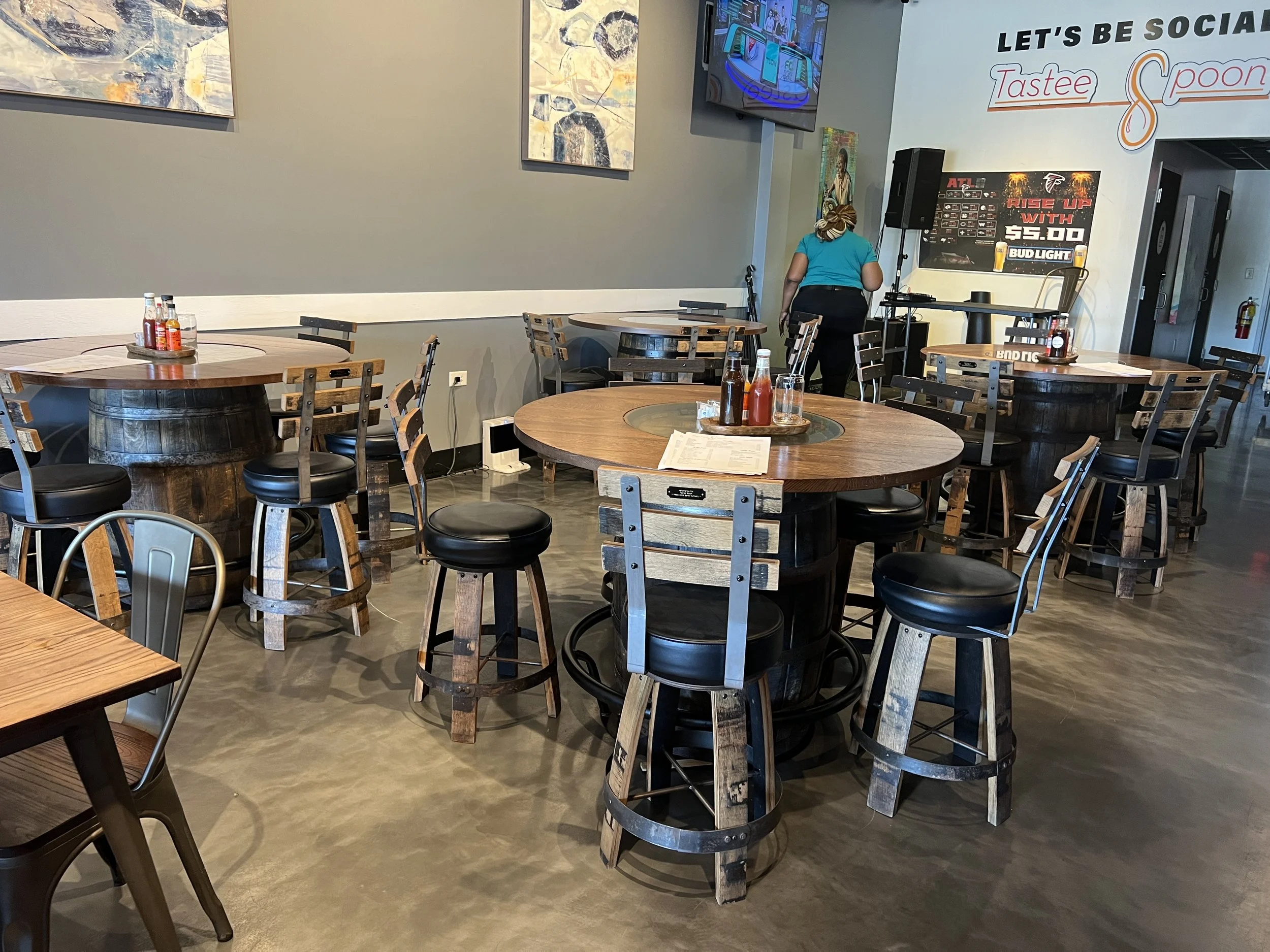 Head on down to Tastee Spoon in Dunwoody, Georgia and enjoy the most delicious Caribbean meal at one of our several whiskey barrel pub tables and stools! You can also find our custom laser engraved rolling snack and drink chest near the front counter and our stemware racks by the bar, all made out of reclaimed whiskey barrels!
