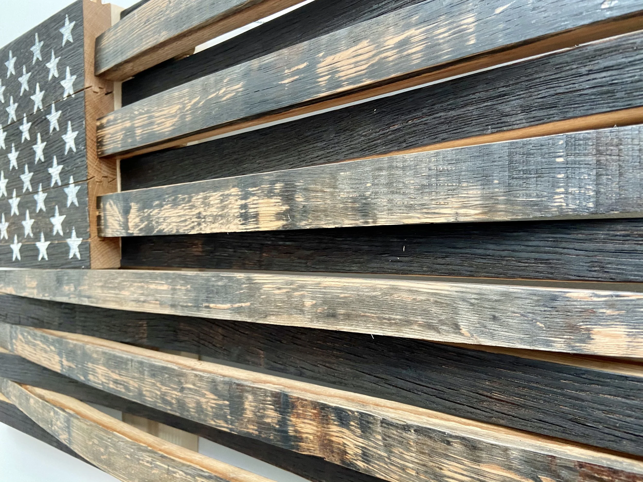 It may not wave in the wind, but our reclaimed whiskey barrel American flags are a beautiful patriotic display of barrel staves and barrel head!