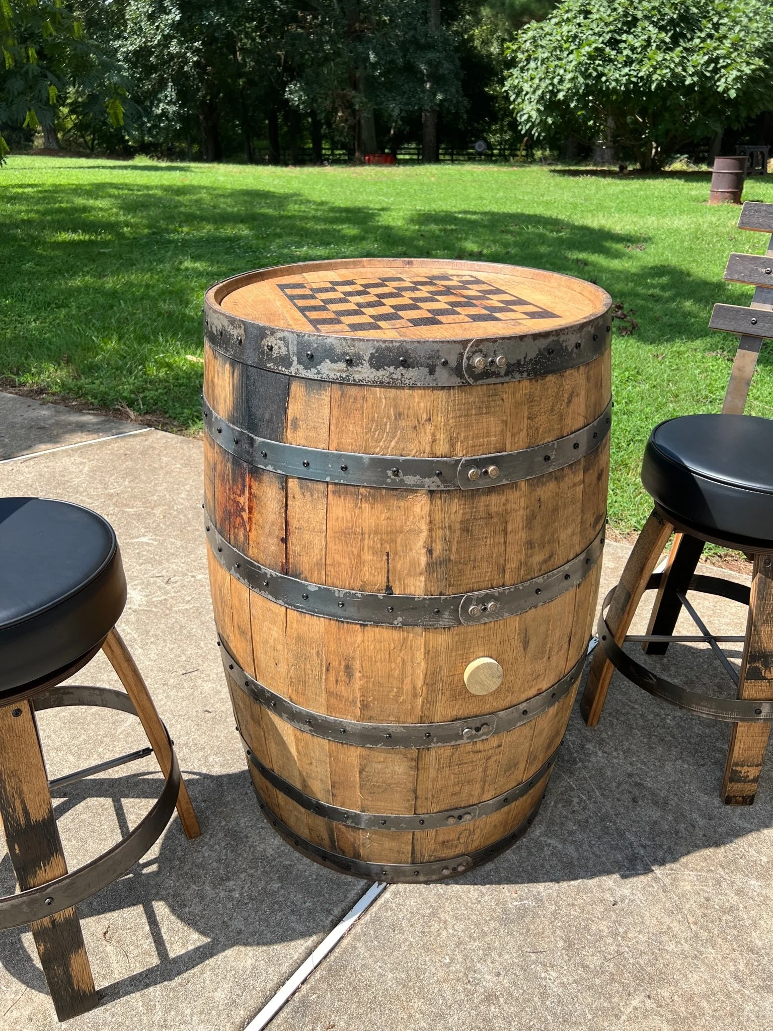 Take our whiskey barrel cabinet with a custom laser engraved chess board and custom swivel bar stools and you’ve got a wonderful addition to your mancave or bar!