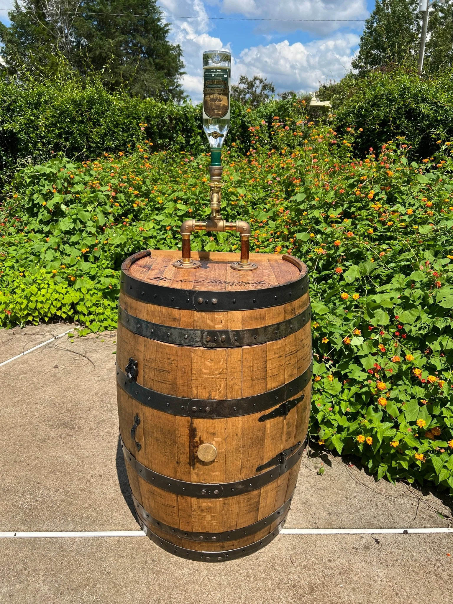 This liquor dispenser is the perfect combination of our popular wall-mounted barrel head liquor dispensers and our barrel cabinets! The cabinet features the “3/4” design with a flat back to allow it to fit flush against the wall. The dispensing hardware is mounted to the top of the barrel that has been laser engraved, and a hinged door provides access to a custom shelf. This is a discussion piece for sure!